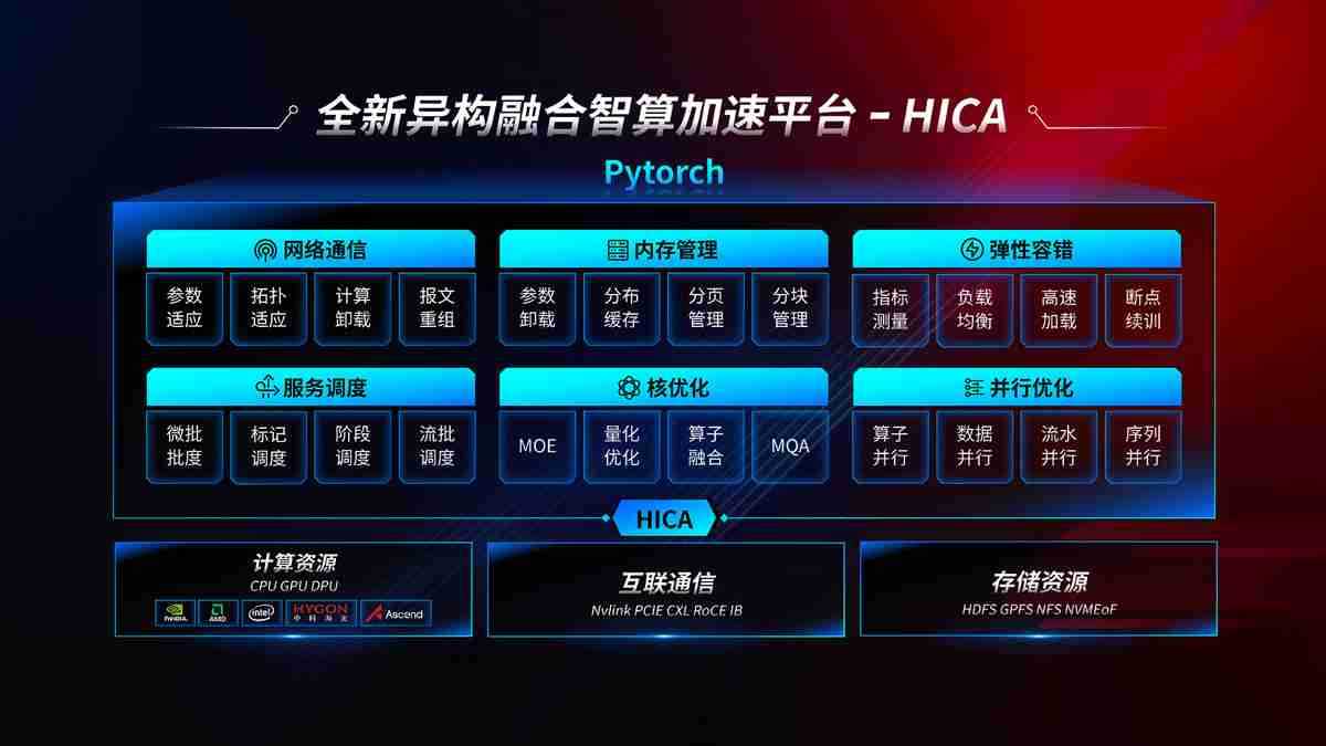 通过自研的服务层、、、、中间适配层、、以及调度编排算法,,,,采用数据并行、、、、模型并行等多种并行方式,,,把并行计算任务进行有效的分解,,使其分别由相应的软件栈和算力资源来承接。。。当GPU资源变化,,,HICA可以实时动态调度计算子任务并调整模型拓扑和架构,,以充分聚合各种算力资源。。。