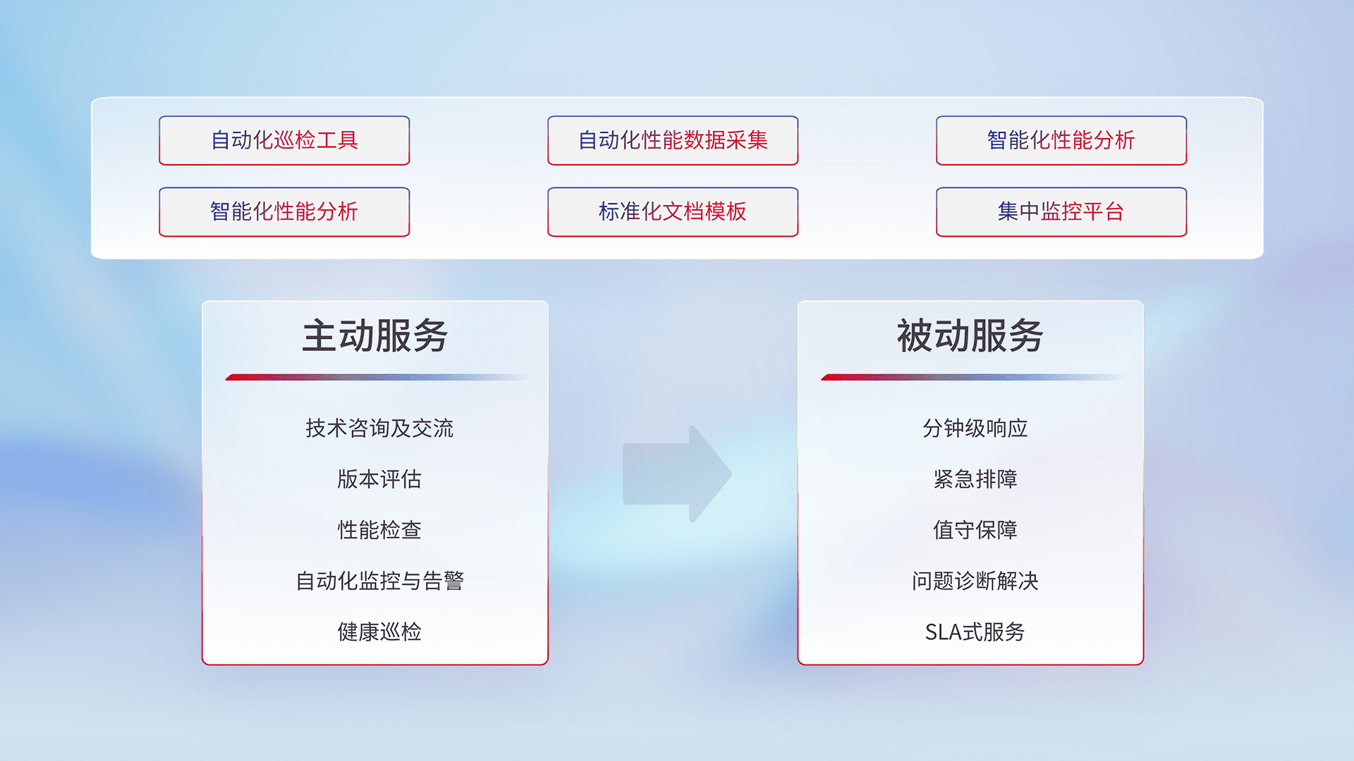 智能化工具和标准化文档,,,保障服务质量,,,提供主动服务(包含技术咨询、、版本评估、、、、性能检查、、、自动化监控与告警、、、、健康巡检)和被动服务包含(分钟级响应、、、紧急排障、、、值守保障、、、、问题诊断解决、、、、SLA服务)。。